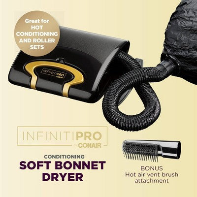The soft bonnet dryer has all the features of the InfinitiPRO by Conair Gold Soft Bonnet Hair Dryer. Perfect for gentle drying or for a deep conditioning treatment, our traditional bonnet dryer gets a modern update with ionic technology for less frizz and more shine! Choose from 4 heat/speed settings for your best look.