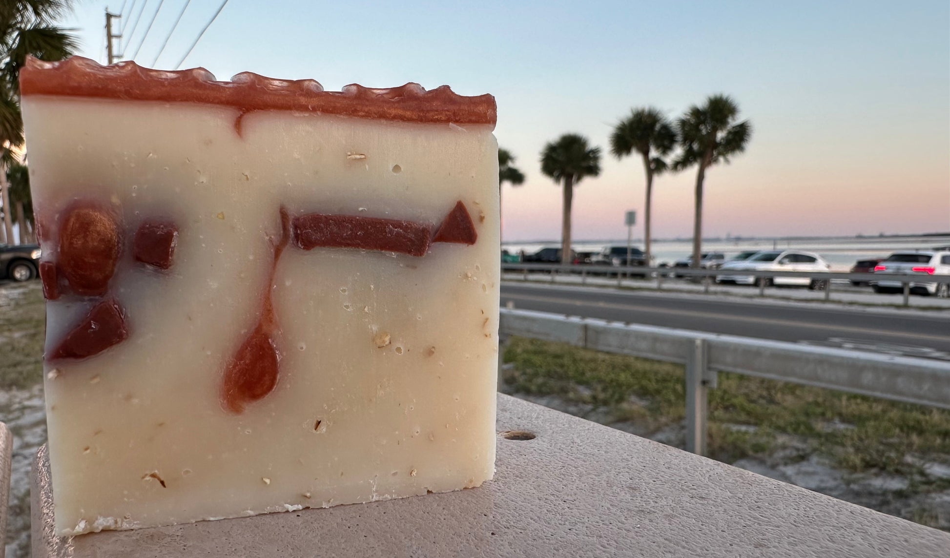 Purified water, saponified oils of organic olive, organic coconut, palm, shea butter, select essential and/or fragrance oil, rolled oats, mica
