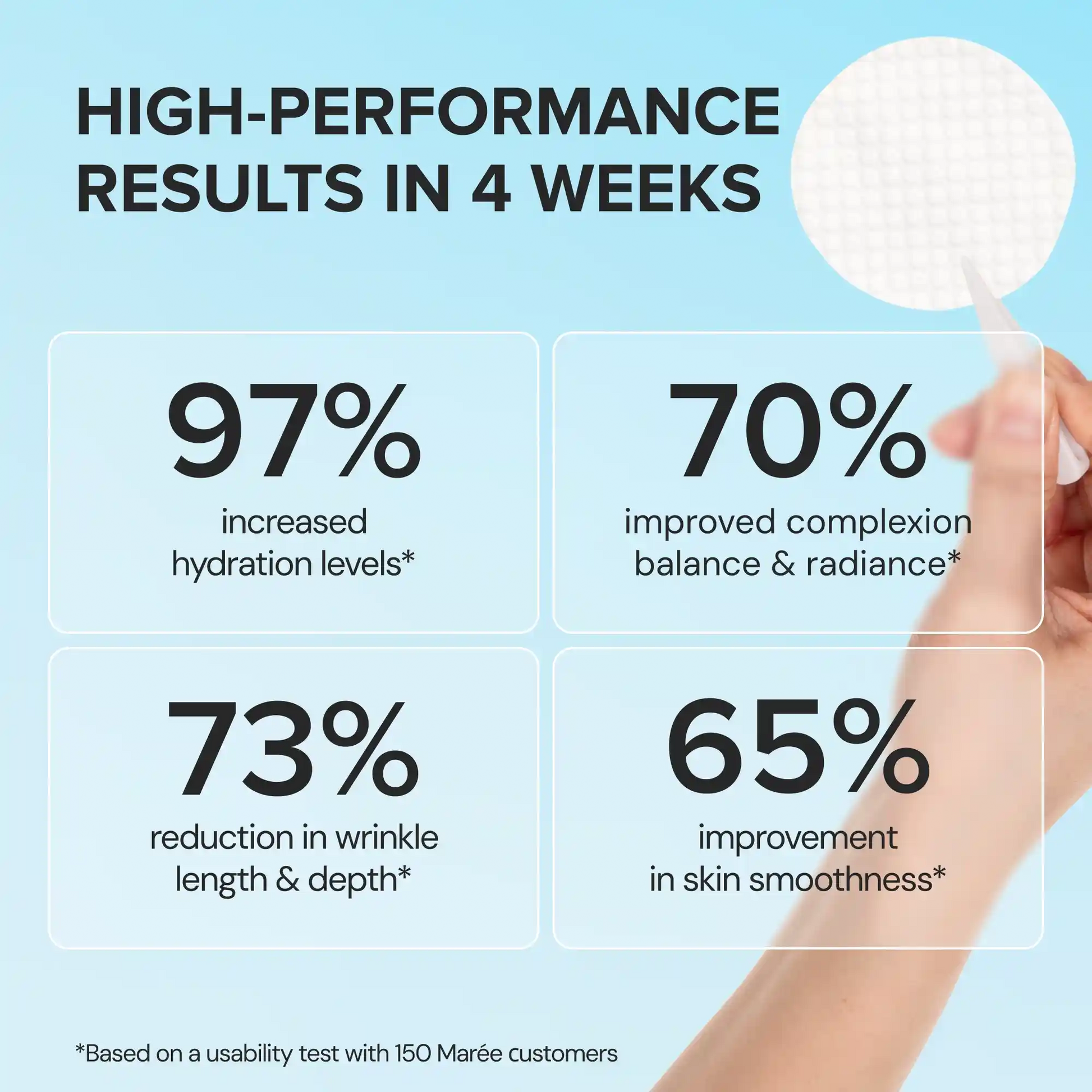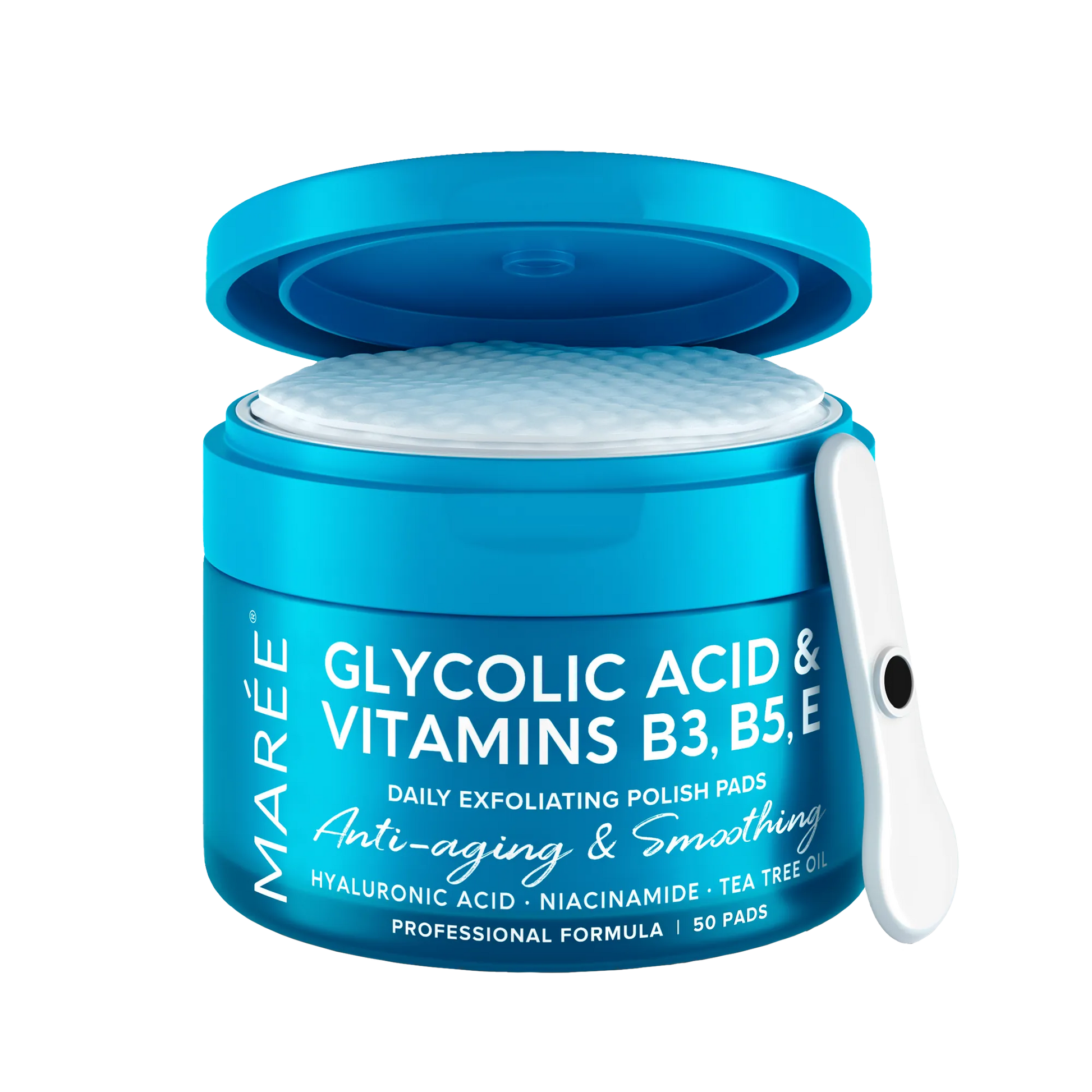 Toner Pads for Glowing Skin—MARÉE Glycolic Acid Pads exfoliate your skin, leaving it soft, smooth, and glowing. Our face wipes and face scrub with glycolic acid use it together with hyaluronic and salicylic acids in one gentle, but effective mix.