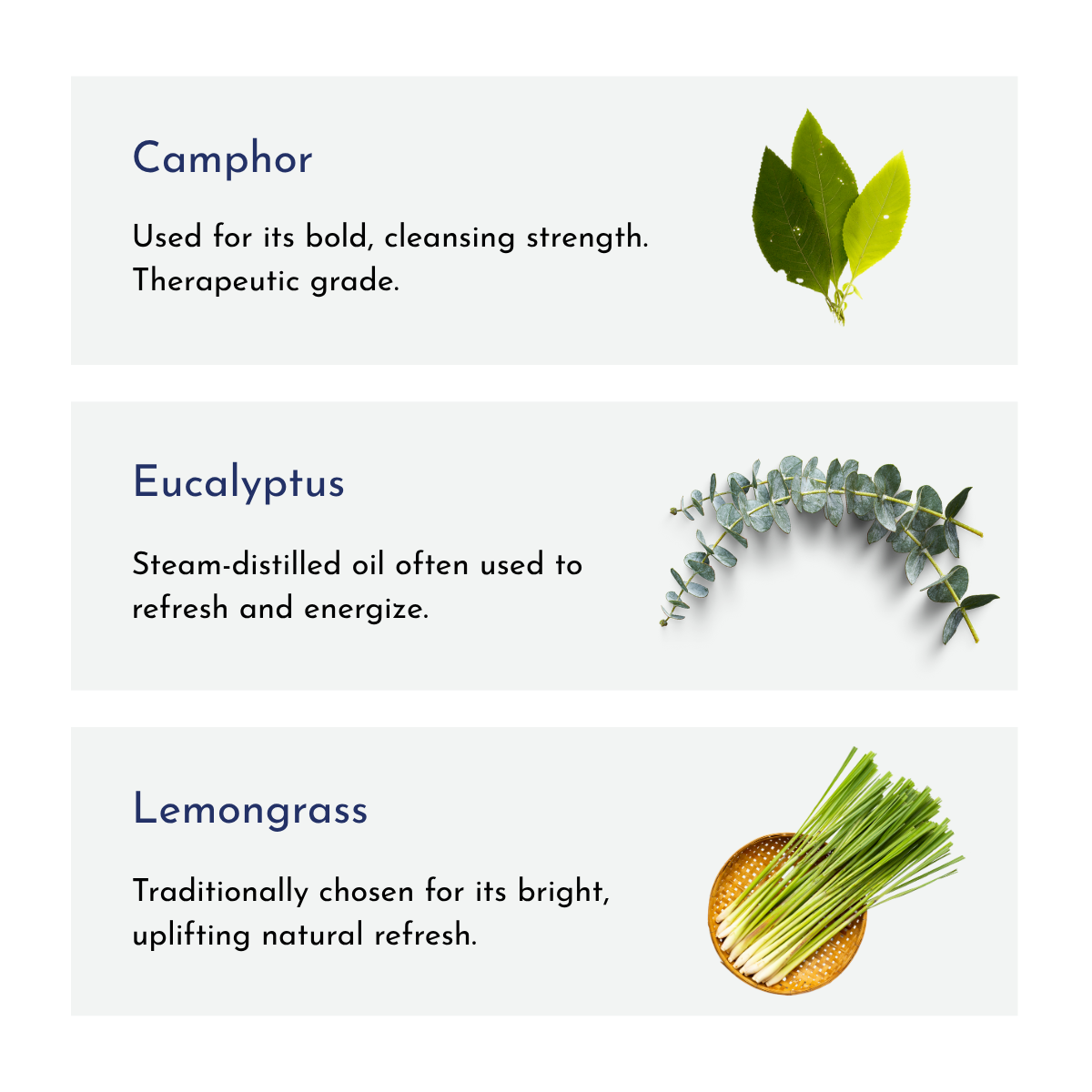 Ingredients: Water, saponified olive oil, saponified coconut oil, essential oils (eucalyptus, camphor, lemongrass)